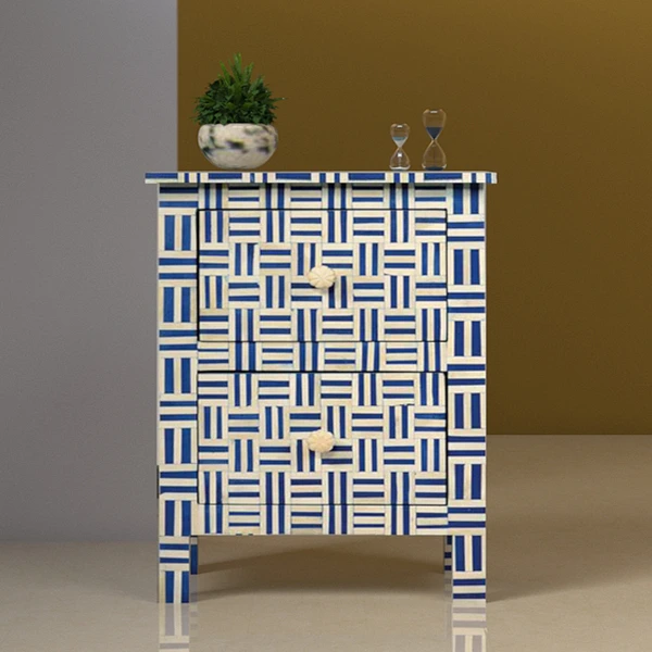 The state of Rajasthan in India is renowned for its Bone Inlay furniture, which is created through a difficult technique that involves a great deal of talent and practise. Within a family, the expertise is passed down from generation to generation. Camel bone is obtained in the first process of manufacturing bone inlay furniture, and pieces are hand-carved to give them a delicate contour. The bone pieces are then glued to the wooden furniture frame to form elaborate designs. The spaces around the bone are filled in the third and final process, generally with a coloured resin background. Animals are not harmed in the production of bone inlay furniture.
